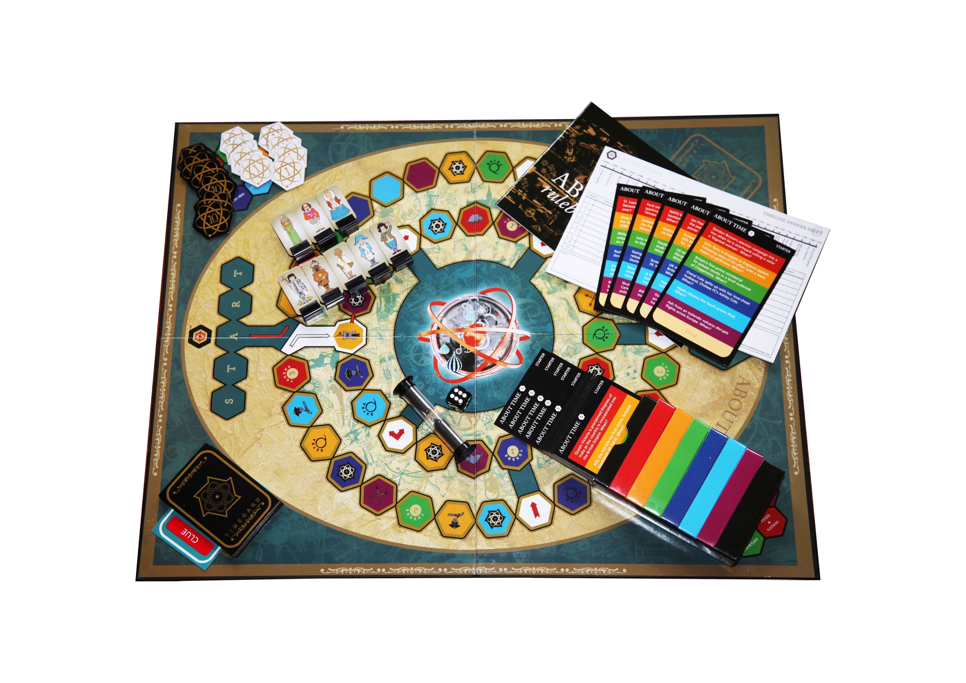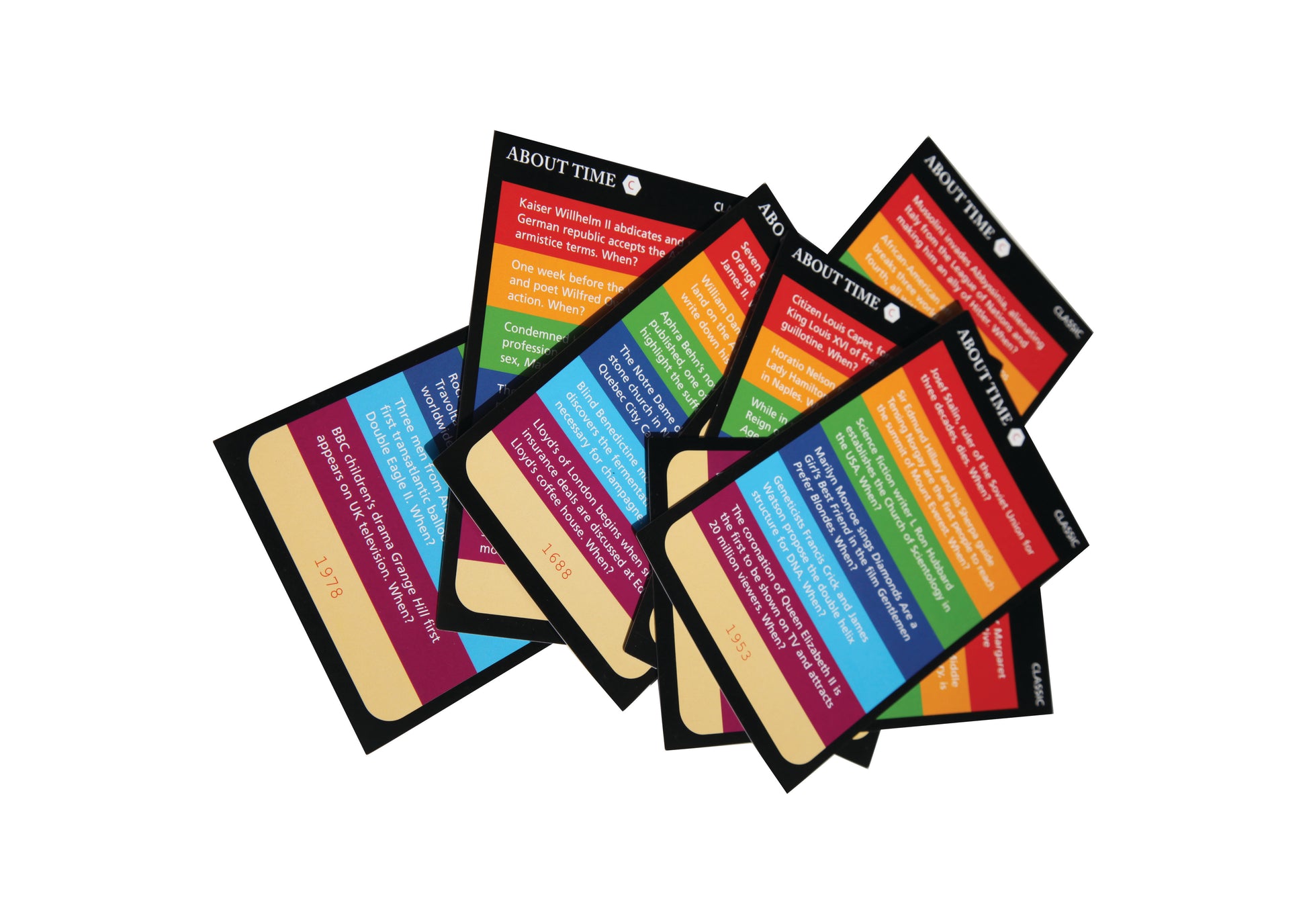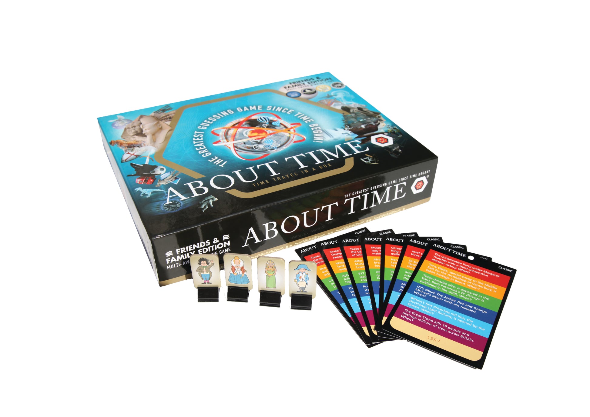 ABOUT TIME The greatest guessing game since Time began…This award-winning multi-player quiz game. It’s fast and infectious, with no waiting your turn as everyone plays in every round. Choose a great historical figure – Napoleon, Joan of Arc, Cleopatra or Mozart – and march onto the stage of history! You’ve got 30 seconds to beat your opponents by guessing the year of an event. There are no wrong answers as you only have to guess closer then the other players. Like history itself, the About Time board is littered with pitfalls and surprises. You can catch the Plague, be held up by Highwaymen or be challenged to a Duel and see your fortunes rise and fall... About Time questions come in six categories – Heroes & Villains, The Arts, Everyday Life, Innovation, Word & Thought and State & Nation. From Ancient Greece to the Eurovision Song Contest, if it made the headlines or history books, we have it covered. It’s suitable for ages 8 to 80 – all you need is curiosity, fast fingers and a love of timeless fun! About Time board game has won consistently great reviews and awards since it was launched on Dragon’s Den in 2007.